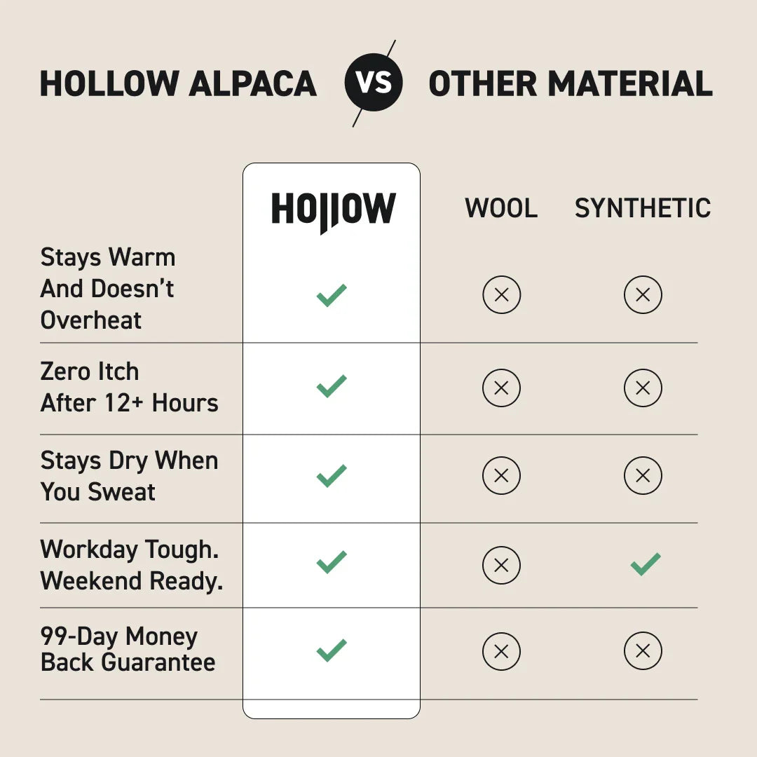Softer than wool and more comfortable than synthetics, alpaca delivers premium comfort without the itch—no matter how far you go.